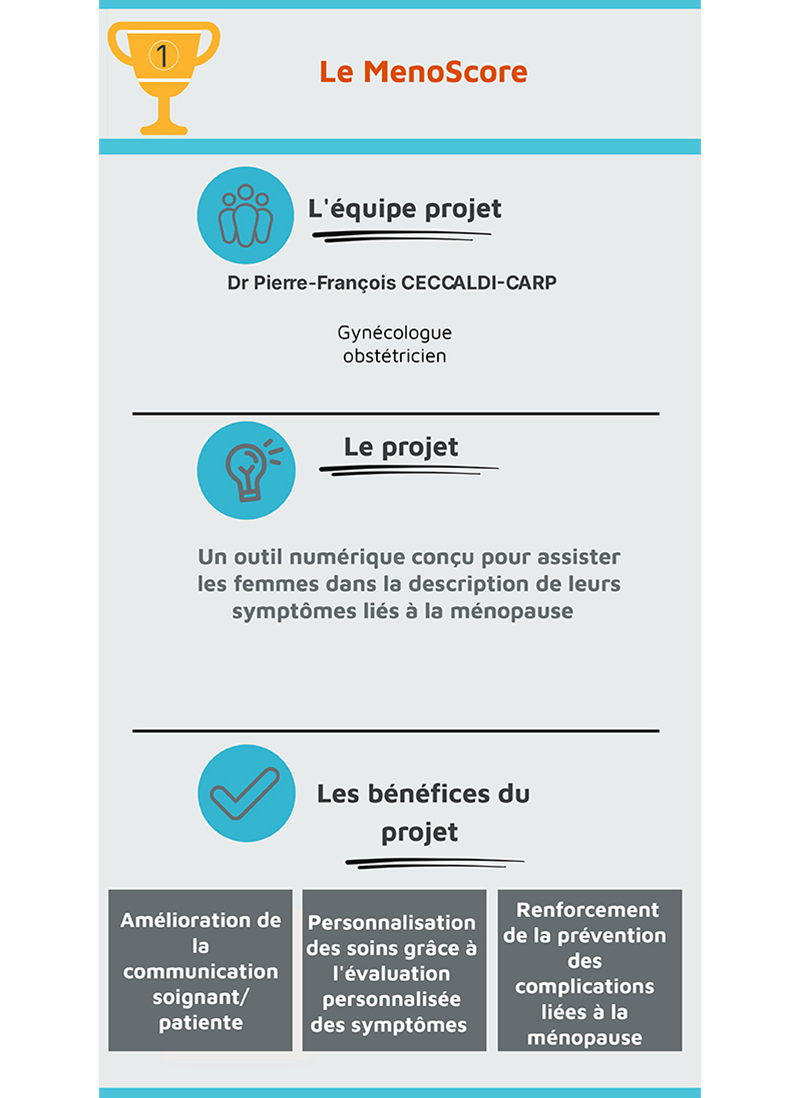 Le 1er Prix de la Prévention Médicale a été attribué au Professeur Pierre-François CECCALDI-CARP, gynécologue obstétricien, pour le projet "MenoScore", outil numérique conçu pour assister les femmes dans la description de leurs symptômes liés à la ménopause et en prévenir les difficultés et complications.