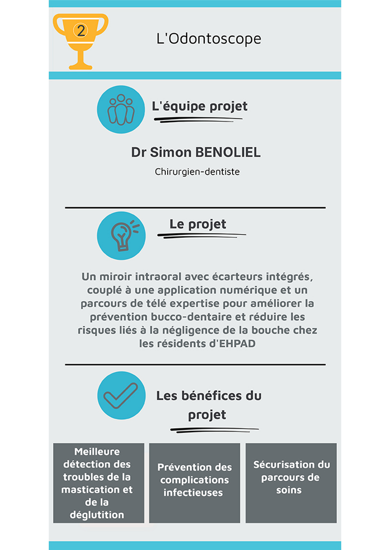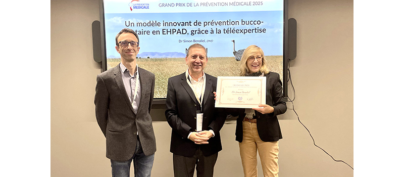 Le 3e Prix de la Prévention Médicale a été attribué au Dr Simon BENOLIEL, chirurgien-dentiste, pour le projet "Odontoscope®" : un modèle innovant de prévention bucco-dentaire en EHPAD, grâce à la téléexpertise.