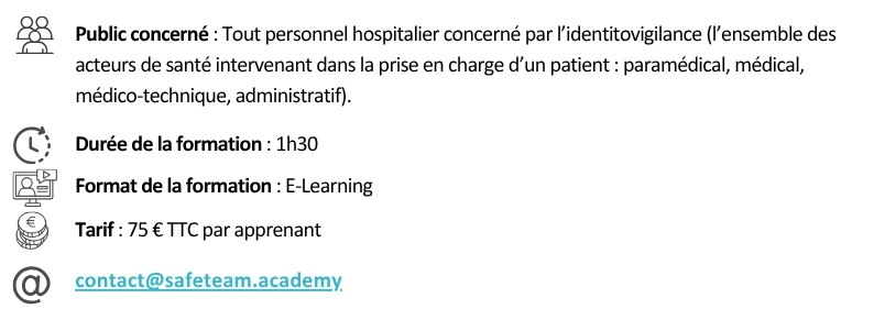 L’identitovigilance est un préalable essentiel à la qualité et la sécurité des soins. Cette formation permet de faire le point sur tous les éléments essentiels et fondamentaux pour une identitovigilance réussie.