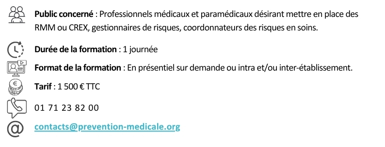 Le dispositif de retour d'expérience (REX) peut combiner plusieurs approches qui ne s'excluent ni ne se substituent les unes aux autres car elle visent des objectifs différents. Or des confusions existent autour des termes RMM et CREX qui sont souvent utilisés de façon erronée. Cette formation s'attachera à clarifier ces différentes notions et proposera aux apprenants différentes manières de les mettre en œuvre, en les intégrant à la stratégie de gestion des risques en soins.